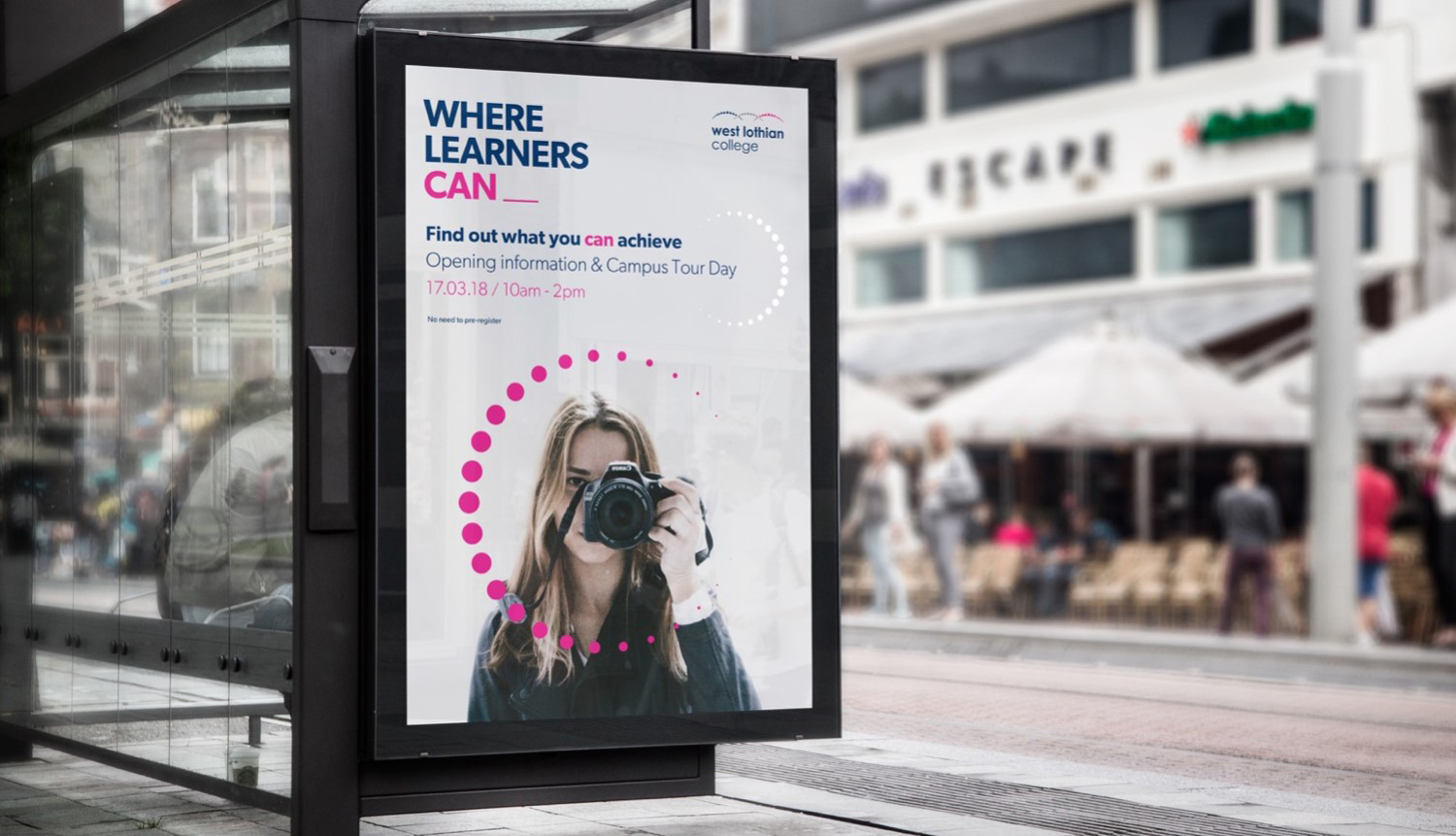 The creative work was tied together by a new proposition for the college — "Where learners can", following the result of 5 focus groups where we uncovered the college's strength is in recognising and supporting individuals to overcome their challenges and achieve their goals — this evolved further into "Where you can" in recognition that the college is a place where more than students can achieve.